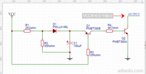 The duration of the circuit output power-down signal can be set: the method is to adjust the capacitance value of C1 and the resistance value of resistor R3. If the value of C1, R3 and R4 is increased, the discharge time of C1 can be prolonged, which also prolongs the time that Q2 is continuously pulled low, and finally prolongs the duration of the circuit outputting the power-down signal. Know that sometimes persistence is important. . .