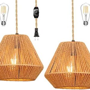 Plug in Pendant Light Rattan Hanging Lamp with Dimmable Switch 14ft Hemp Rope Cord Boho Woven Lampshade Wicker Bamboo Hanging Lights Fixture with Plug in Cord Pendant Lamp for Bedroom Kitchen Island