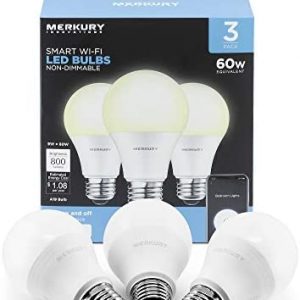 Merkury Innovations A19 Smart White LED Bulb 60W Non-Dimmable 3-Pack, Voice Control, Hub Compatible, 9 Watt, 800 Lumens, 3 Pack
