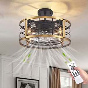 DADUL Caged Ceiling Fan with Light, Ceiling Fan with Lights Remote Control, Small Bladeless Ceiling Fan Suitable for Bedroom, Living room, Study and Kitchen (Black+Gold)