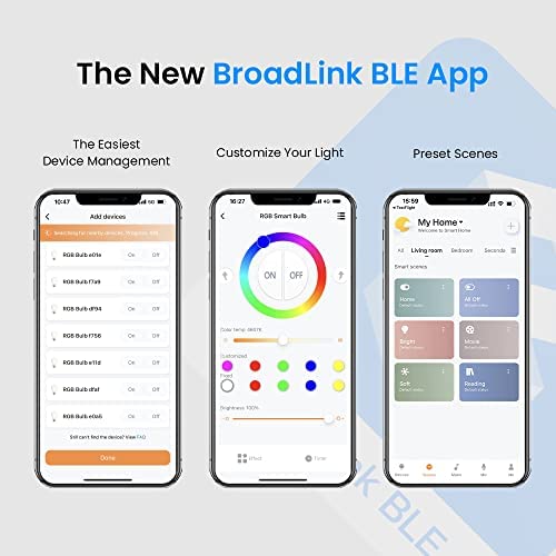 【Zero Setup】Download the new app – BroadLink BLE, keep the Bluetooth on, power up the devices and wait them to be discovered in the App. Up to 90 devices can be added at the same time in 1 second. No need to create account. Fast and easy to use without privacy concerns. Supported by BroadLink exclusive technologies – FastCon and Bluetooth Low Energy (BLE).