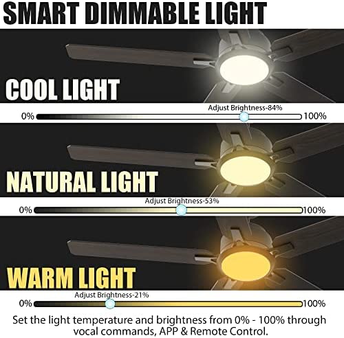 Dimmable LED Light: The light and fan can be controlled separately. This black ceiling fan includes 3 types of light: 4000K for the cool light, 3000K for the full light and 2700K for the warm light. The lights of our modern ceiling fan are dimmable from 1% – 100%. you can satisfied your needs at different scenarios. And you can also group the LED light with fan and/or other smart devices to control multiple devices with one touch on the mobile phone or one voice command.