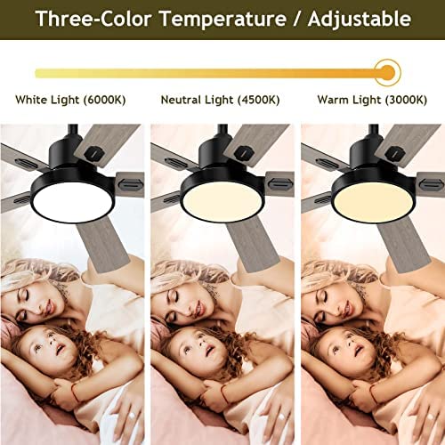 Adjustable LED Lights: 52 inch ceiling fan with lights, 24 watt LED lights, LED lights last longer than traditional bulbs. Press the ON/OFF button on the remote control continuously to change the color temperature from cool white (6000K) to warm white (3000K) to natural light (4500K).