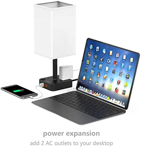 COZOO USB Bedside Table & Desk Lamp with 3 USB Charging Ports and 2 Outlets Power Strip,Black Charger Base with White Fabric Shade, LED Light for Bedroom/Nightstand/Living Room