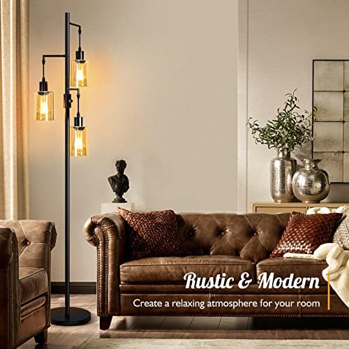Dimmable Farmhouse Floor Lamp for Living Room, Industrial Tree Standing Lamp with 3 Amber Glass Shades & Incandescent Bulbs, Rustic Vintage Tall Pole Light with Metal Base for Bedroom Office Study E26