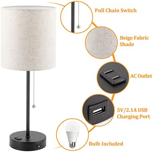 Dott Arts USB Bedside Table Lamp, 2700K-5000K Nightstand Lamp with Pull Chain, Table Lamp Set of 2 with USB Port & AC Outlet, Lamps for Bedrooms Living Room, 2 Bulbs Included,Beige Shade,2PK,Black