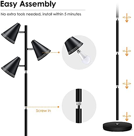 Premium Quality and Easy Assembly; We regard the safety issue as the priority, with an extra-large base (10 inches diameter) and the premium metal material, the black industrial floor lamp is sturdy enough from being knocked over easily; To release your assembling worries, 3 lampshades are pre-installed when packed, you just need to screw several pole parts to finish, easy in 5 mins without tools; Also, we have prepared both instructions in the package and installation videos on the product page