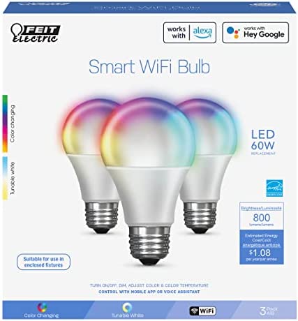 Feit Electric Smart Light Bulbs with RGB Color Changing and Tunable White, 2.4Ghz WiFi Light Bulbs, No Hub Needed, Works with Alexa and Google, Dimmable 60 Watt = LED 9W, OM60/RGBW/CA/AG/3, 3 Pack