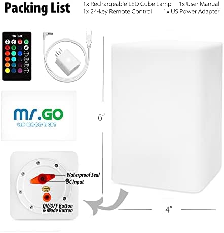 Mr.Go 6-inch Dimmable LED Night Light Mood Lamp for Kids and Adults – 16 RGB Colors – 5 Level Dimming – 4 Lighting Effects – Rechargeable – Remote Control – Decorative – Fun and Safe – White Cube