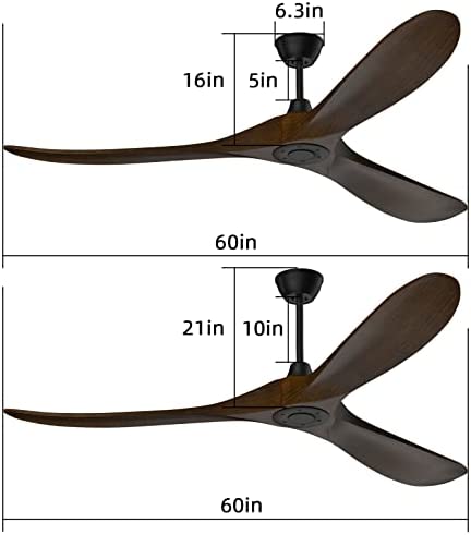 Ceiling Fan Dimensions: Diameter: 60″; Height: 16″ and21″(From Ceiling to Bottom of Fan Light, Includes 5″ Short Downrod and 10″ Long Downrod)