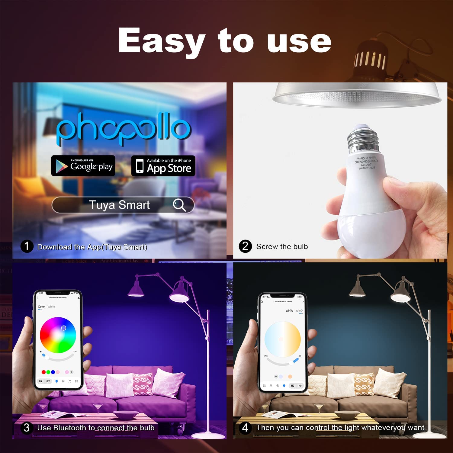 phopollo Bluetooth Light Bulbs, RGBW Multicolor Led Light Bulbs, 9W 800 Lumen, 60 Watt Equivalent, A19 E26 Led Bulbs, App Control (Alexa & Google Assistant Not Supported), No Hub Required, 10 Pack