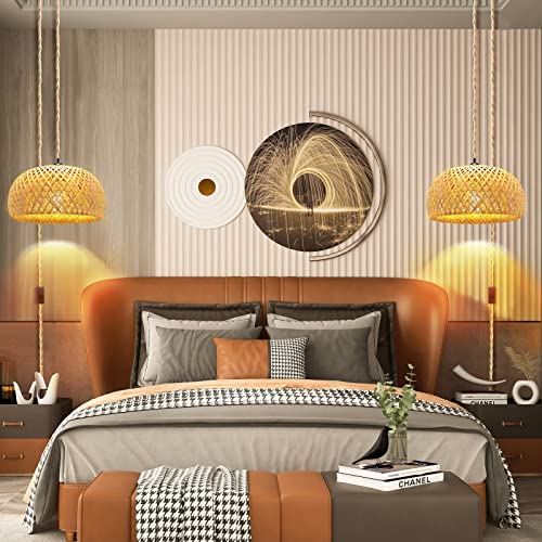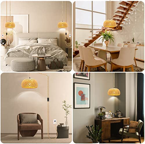 Plug in Pendant Light, 3 Color Bulb Pendant Light Fixtures, Hanging Light with 15 Ft Hemp Rope Cord On/Off Switch, Bamboo Lamp Shade Wicker Rattan Hanging Lights Fixture for Bedroom, Kitchen Island