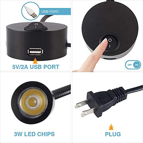 Plug-in Wall Mounted Reading Light with USB Charging Port, LED Bedside Wall Lamp with Flexible Gooseneck, Black Finished(3W Warm White)