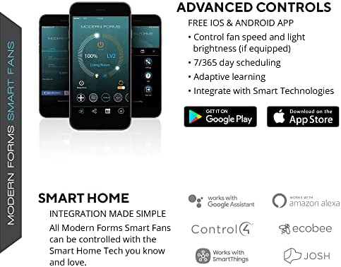 Free app download: Sync with our exclusive Modern Forms app to control fan speed, use smart features like breeze mode, adaptive learning, create groups, and reduce energy costs. New: Bluetooth compatible for improved range and an unlimited amount of fans can be controlled with remote or wall control within range.