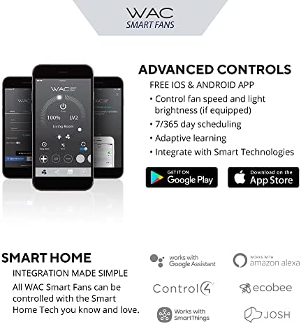 WAC Smart Fans can be controlled from the WAC Smart Fan app, enabling smart features and full control of your fan from an iOS or Android device. Download the app to pair with the smart home tech you know and love, including Google Assistant, Amazon Alexa, Samsung Smart Things, Ecobee, Control4, and Josh AI. Coming Soon: Savant, Lutron Homeworks, and Nest.