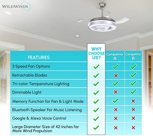 WILDWINDS 42″ Retractable Ceiling Fan With Bluetooth Music Player Speakers | 3 Dimmable LED Lights With Adjustable Speed & Remote Voice Control | Perfect For Bedroom, Living Room & Kitchen