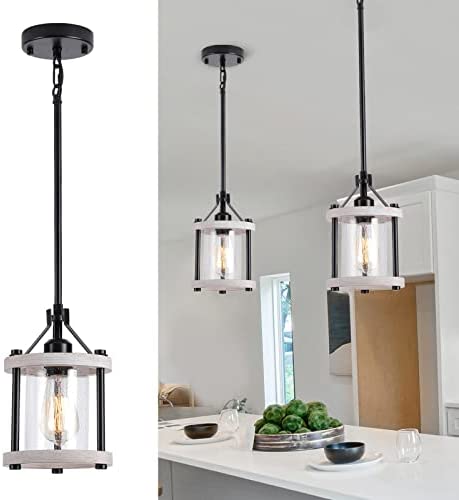 XSDeTu Farmhouse Pendant Light in Wood and Metal Cage, Rustic White Wood Pendant Light with Glass, Adjustable Glass Hanging Light Fixtures, Mini Pendant Lighting for Kitchen Island, Foyer, Hallway